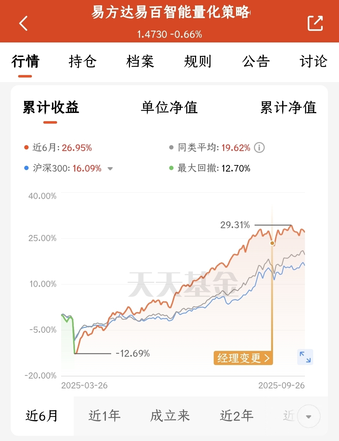 今天股市震荡上行,不过板块还是轮动。在牛市买量化策略能有效应对市场轮动,避免踏空风险。$易方达易百智能量化策略C$ 近一年表现突出,上涨60多个点。另外其优势在于:一是策略优质,长期跑赢大盘,牛市时更能放大收益;二是通过高频调仓快速适应行业轮动,持续领先市场表现。这种量化产品特别适合快速变化的牛市环境。今天先上车了!