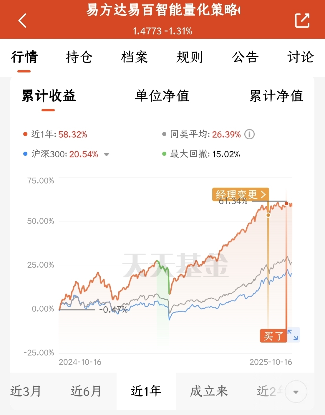最近股市震荡行情,今天又不是太好。牛市震荡行情之下,买量化不怕轮动、防止踏空。$易方达易百智能量化策略C$ 近一年涨幅58.32%,业绩走势更优收益体验好。投资策略优质,长期跑赢大盘,且在牛市时可以放大收益;牛市轮动快,量化产品高频调仓,无惧行业轮动持续跑赢市场。