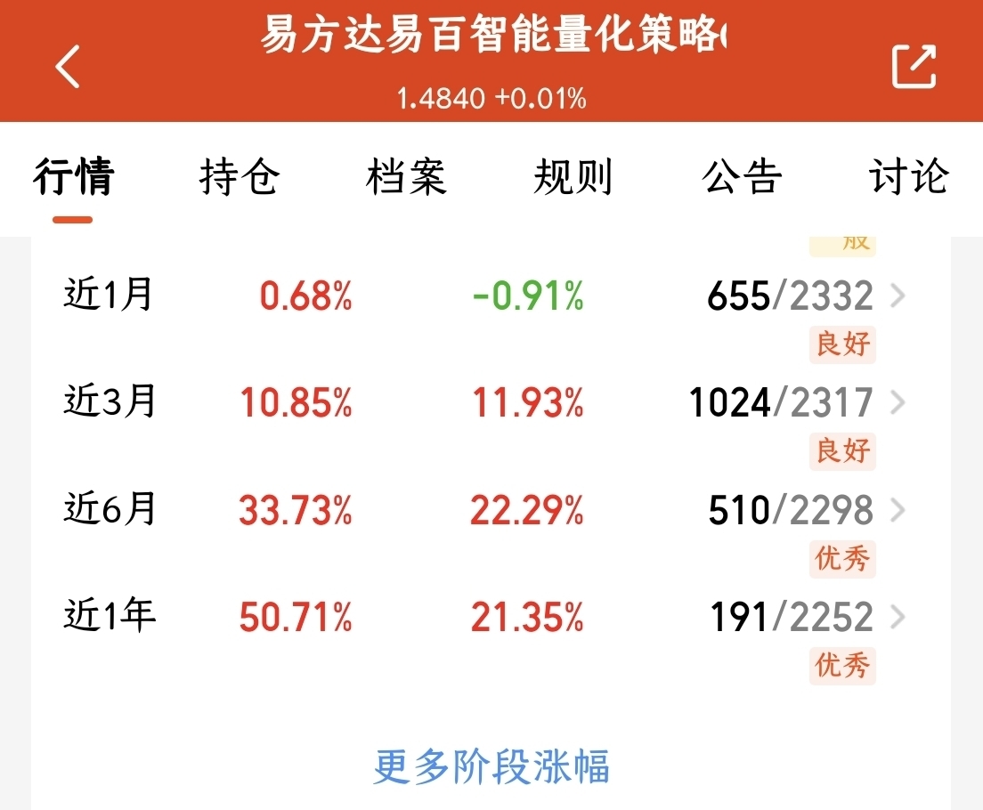 现在是牛市震荡期,买量化基金能有效应对市场轮动,避免踏空风险。$易方达易百智能量化策略C$ 近一年涨幅50.71%,业绩稳步领先,收益走势持续优化,稳定跑赢市场。真的是很适合追求长期收益增长的小伙伴,能够轻松实现财富增值。