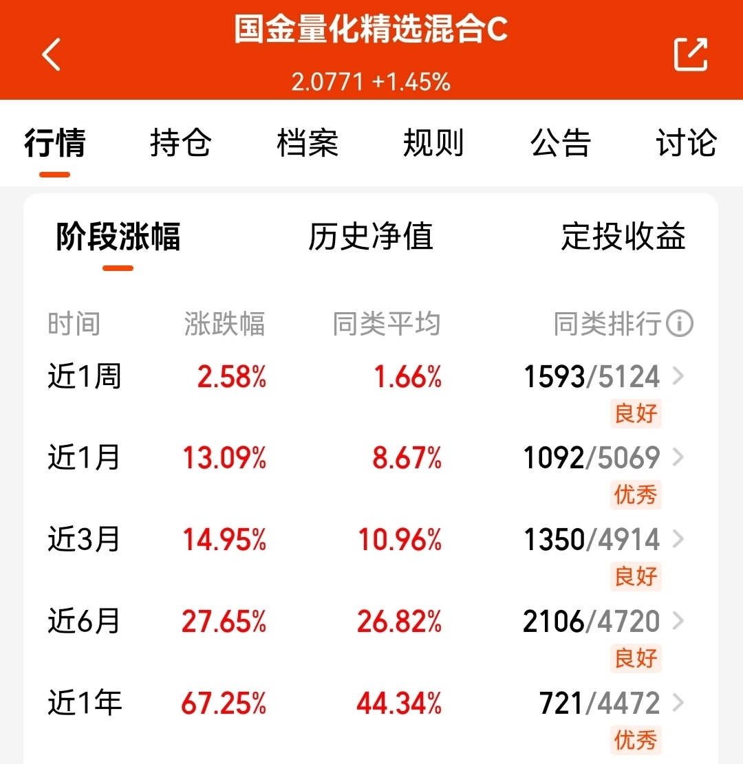 今天高开啦,$国金量化精选混合C$ 也涨得不错,最近限额放开,各阶段业绩都挺稳,很适合拿长期