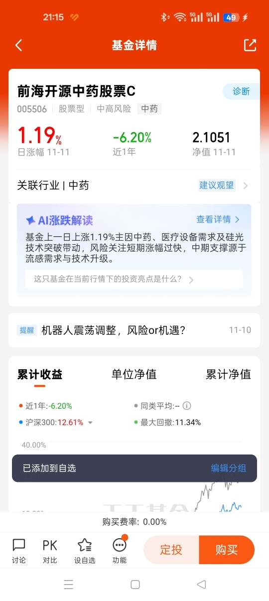$前海开源中药股票C$ (005506)作为聚焦中药赛道的股票型基金,覆盖传统中药、创新中药、中药OTC等核心领域,精准捕捉行业结构性机会。该基金虽近12个月表现承压,但2025年11月11日单日涨幅达1.19%,显示板块情绪回暖迹象,且免申购费的C类属性适配中小投资者灵活操作。