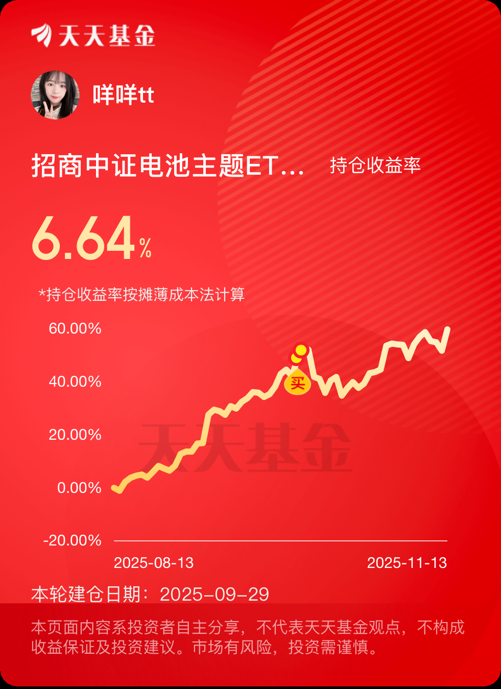 恰好我今天买的招商中证电池指数ETF联接C成分股精选50家锂电全产业链龙头,固态电池含量超过40%,储能含量超过25%...精准卡点储能+固态电池双风口,因此业绩弹性也不错,近3月大涨59.73%,近6月大涨52.99%。指数昨天突破大涨我没追,今天电池指数回踩5日线,小跌1.5%不到,我就小加一份赶紧做个低吸。