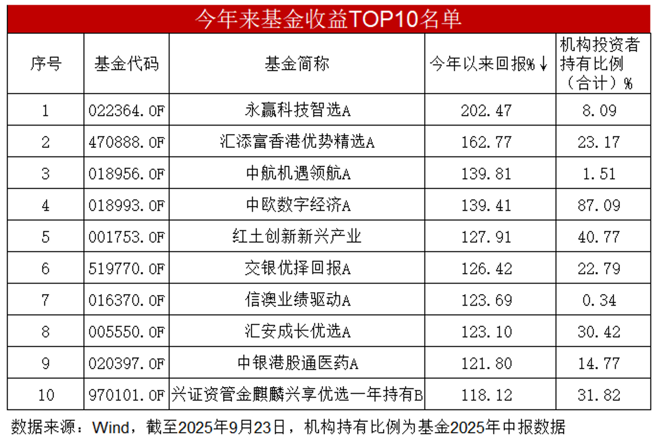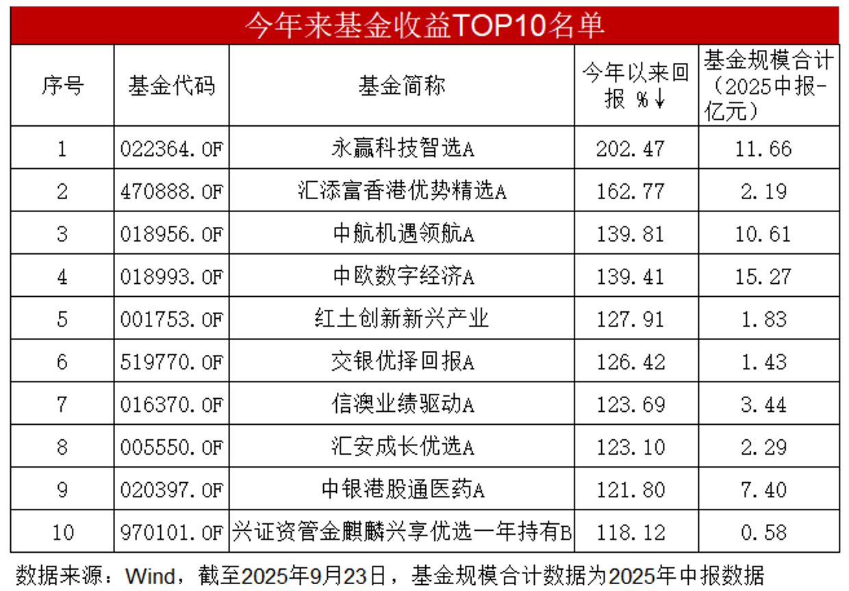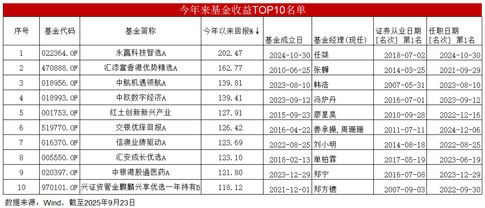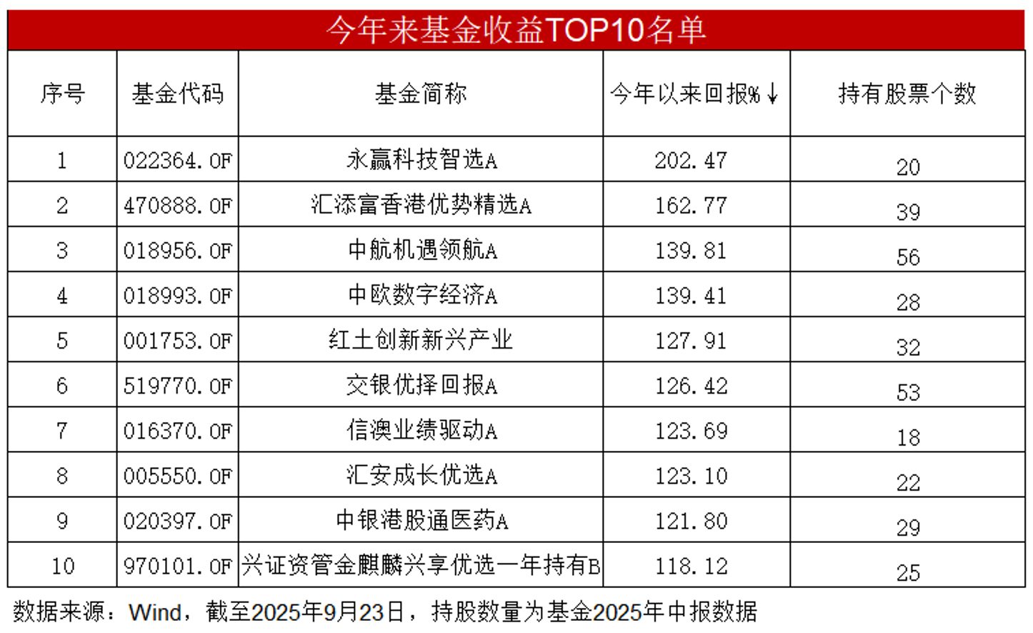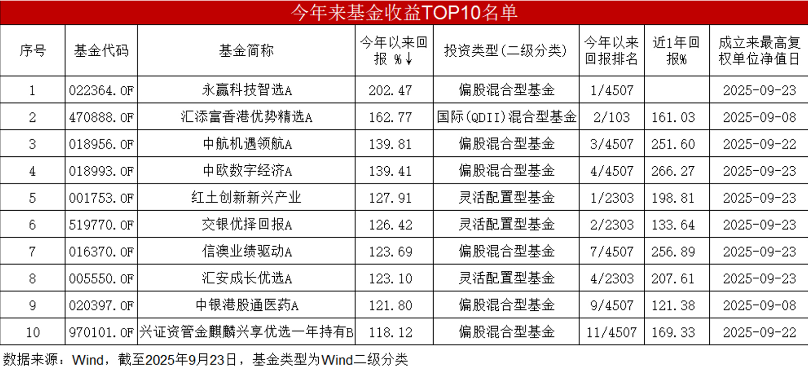 在“牛味渐浓”的当下,主动权益基金大有王者归来态势。司令统计了下截至9月23日的基金数据,若是仅统计基金主代码的话,年内收益翻倍的基金已扩大到51只,主动投资方向占据大头,位居TOP10行列的更是清一色的主动管理基金,年内回报均超118%,近一年回报更有多只超过200%;多数在9月23日复权单位净值又创下成立来新高!