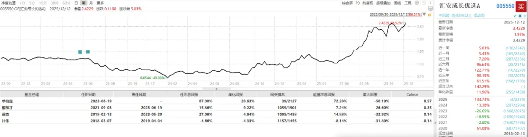 根据wind数据,单柏霖自2023年6月19日掌舵汇安成长优选混合A(005550)以来,截至2025年12月12日,累计回报87.1%,年化回报率为28.65%,同类排名前2%,业绩非常出众。