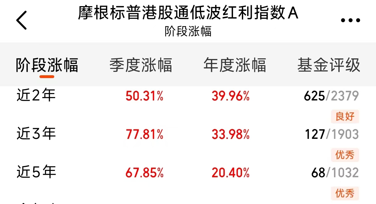 投资黄金渠道门槛变高,规则也更复杂,工行都暂停交易了,是不是心凉了半截?但我说啊,危机里藏机会!你们还在追涨杀跌,我已经悄悄切换赛道,重仓了$摩根标普港股通低波红利指A$(005051)!为啥选它?市场现在乱成一锅粥,大盘虽然冲上4000点,可科技股涨得我心慌,万一回调,赚的钱全得吐回去!但红利资产才是四季度“避风港”,尤其是港股红利——股息率长期7%以上,比A股红利高出一大截,同样的公司,港股便宜得多,分红还更狠!看看数据,今年港股红利基金平均涨12%以上,霸屏涨幅榜,而A股红利还在原地踏步。我这基金近一年涨26.15%,今年以来创新高58次了。最大回撤才-9.39%,跌得少、涨得稳,机构早就狂买54%了!现在布局,就是抢在风格切换前夜:四季度红利股胜率超高,资金正从高估值成长股流向低估值价值股。别等震荡期亏麻了才后悔,红利才是低利率时代的“硬通货”。 #AI应用类股票大涨:短剧概念逆势走强#