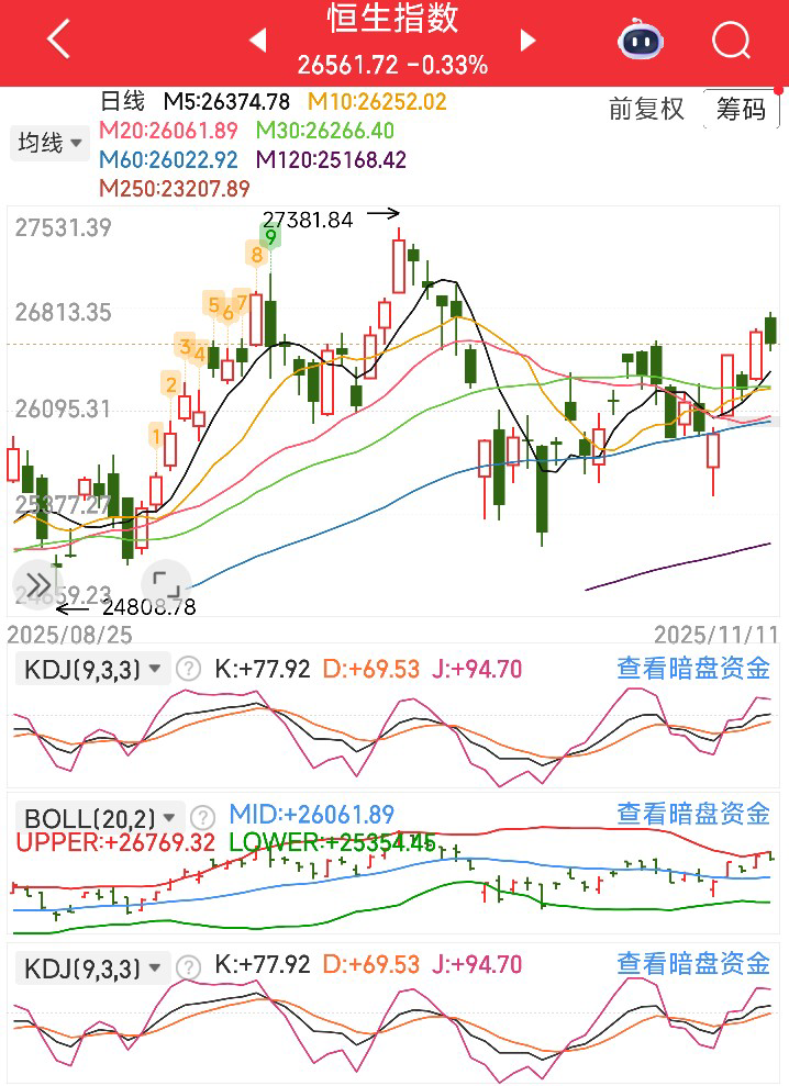 技术面看,恒生指数已经走出底部,均线系统逐步走好,虽然短期涨得有点快,但整体趋势还是向上的,我不会一看到涨就冲进去,反而会等市场稍微回调一下,等量能跟上再慢慢布局,现在市场情绪比较平稳,不是那种疯涨的行情,而是稳扎稳打的震荡上行。