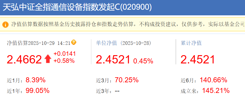 我继续右侧出手,今天再加$天弘中证全指通信设备指数发起C$ ,CPO指数业绩还挺能涨,近6月涨幅140.66%,爆发力强的同时防守力也不错的说。我近期也集中火力猛做了一波,要是低位的时候多上点就更好了。不过CPO、算力链目前风口正旺,产业事件密集,我觉得行情也没那么容易熄火,今天板块内部分化反而也是个机会,指数操作起来也简单。