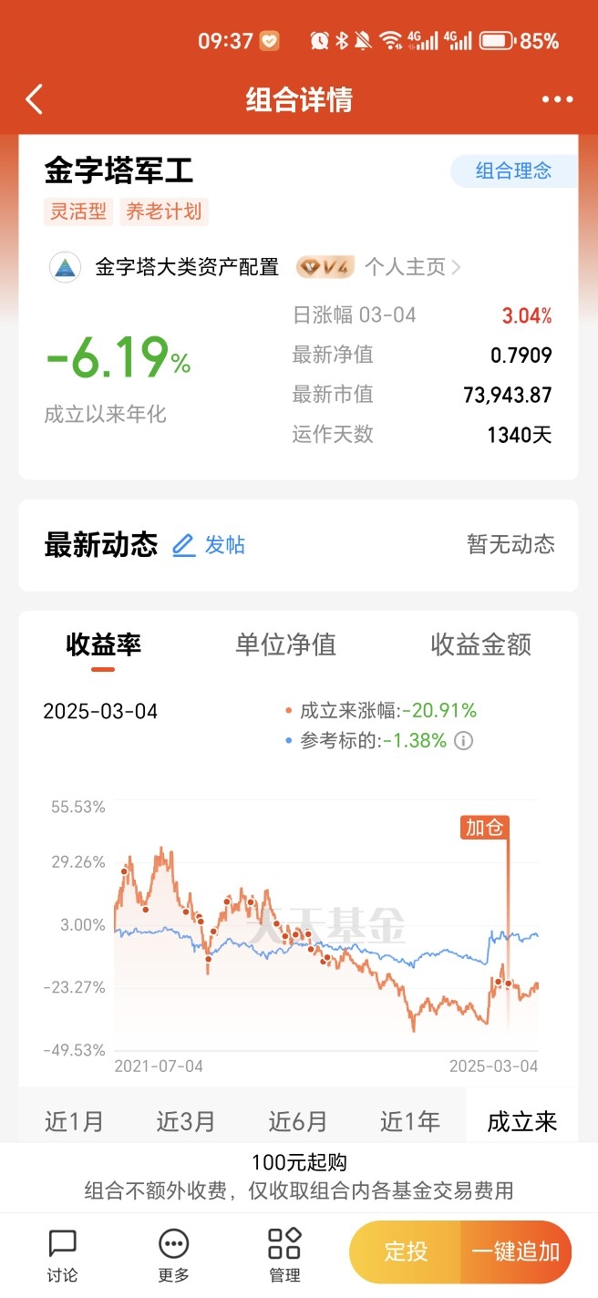 军工组合成立时间2021年7月4号,截止到昨天,是我公开实盘军工组合的1340天,昨天涨幅3.04%,成立以来累计收益率-20.91%,成立以来年化收益率-6.19%,仓位满仓