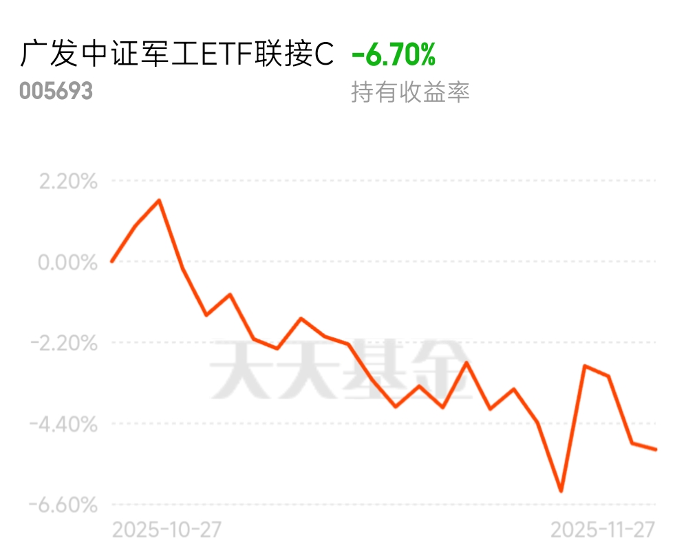 今天军工有点起来的意思了啊,果然好的板块还是会受到资金追捧的,拿着这只没啥毛病$广发中证军工ETF联接C$