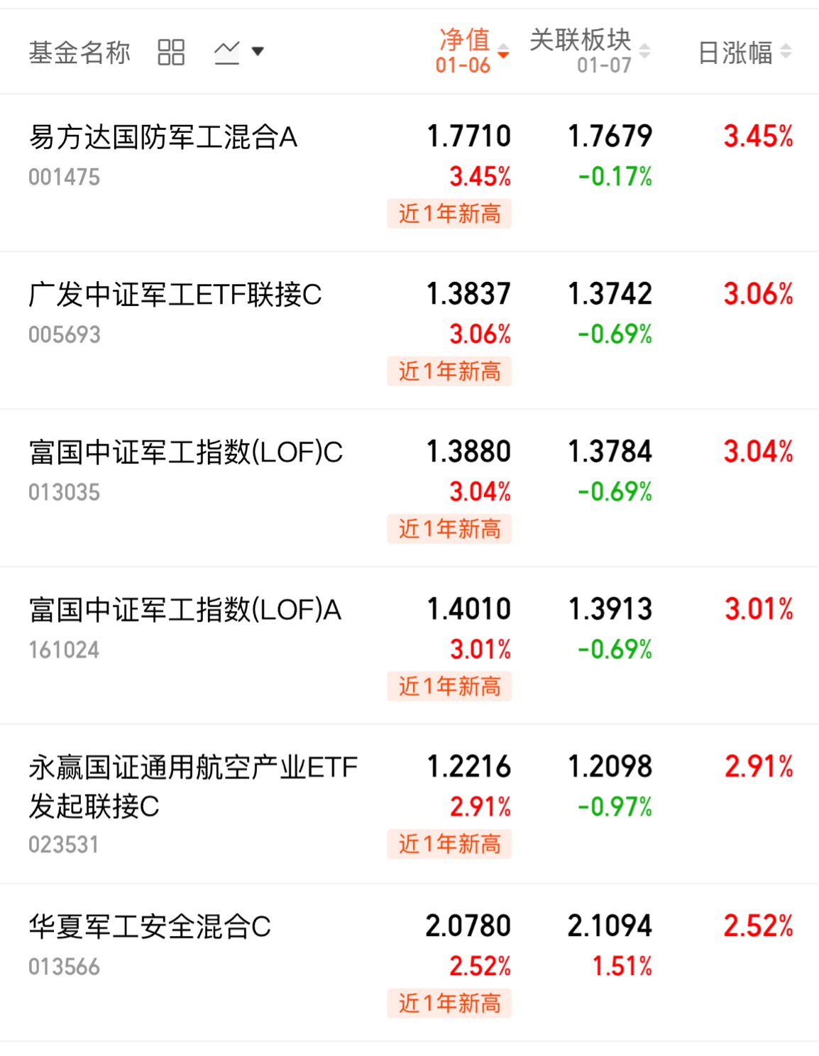 在此背景下,$易方达国防军工混合A$ 日涨幅显著超越同类基金/标的。$广发中证军工ETF联接C$