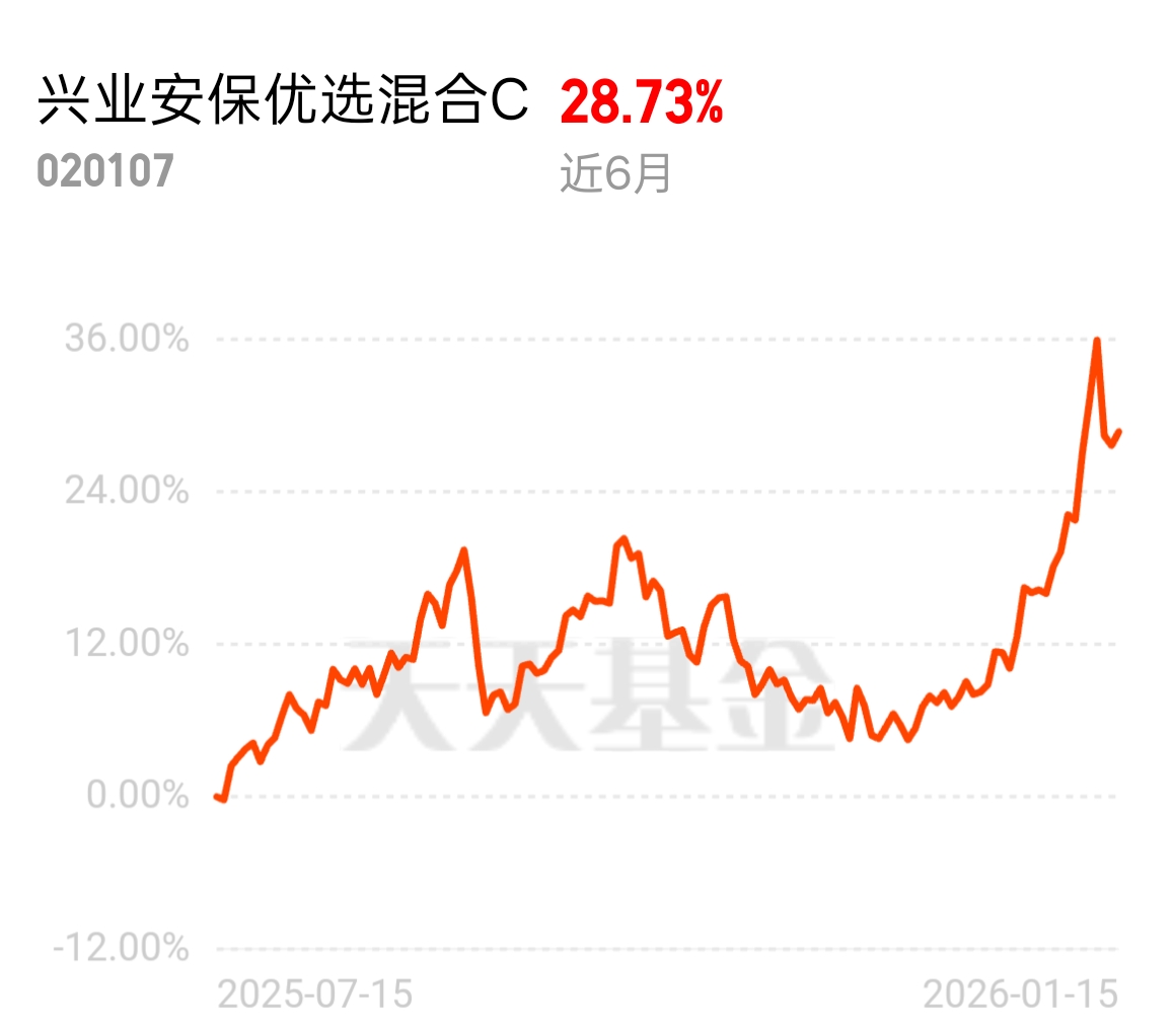 军工板块现在调整明显,商业航天概念领跌,军工 ETF 也跟着下跌,安保板块却依旧红盘,兴业安保优选混合 C 涨着,近 6 月 28.73%,绿基换这个准行$兴业安保优选混合C$