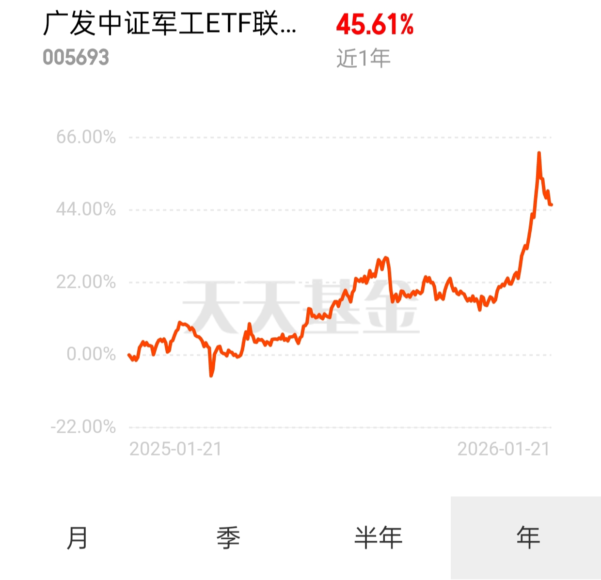 早盘还不错,我今天加了点$广发中证军工ETF联接C$(005693),2026年应该可以,基金近一年涨50%,值得长期拿#2025超额关键词#