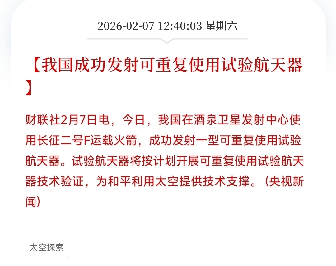 军工有个利好,是成功发射可重复使用试验航天器。关键词是试验航天器,而不是可回收火