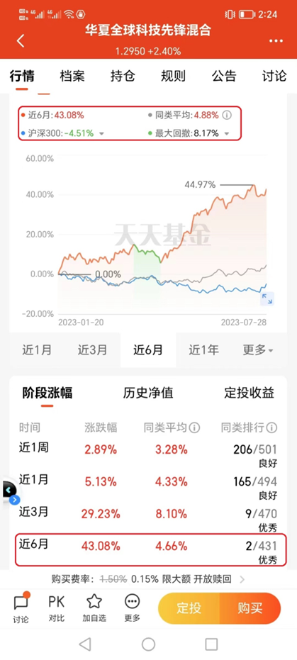 美股上升的最大动力就是科技板块,今年伴随着AI人工智能的飞速发展,如英伟达,微软,苹果、脸书等布局AI的大型科技公司。以及超威半导体等为AI发展提供算力芯片公司都有绝佳表现。而这些基金早早就被$华夏全球科技先锋混合$ (005698)收入囊中,故而今年以来涨幅飙升,业绩超能打,各个阶段的统计中都有很好的表现。今年来涨幅达到48.34%,尤其是近半年涨幅达到43.08%,超过同类平均38.2%,跑赢沪深300指数47.59%,在全市场基金中取得第二的好成绩。