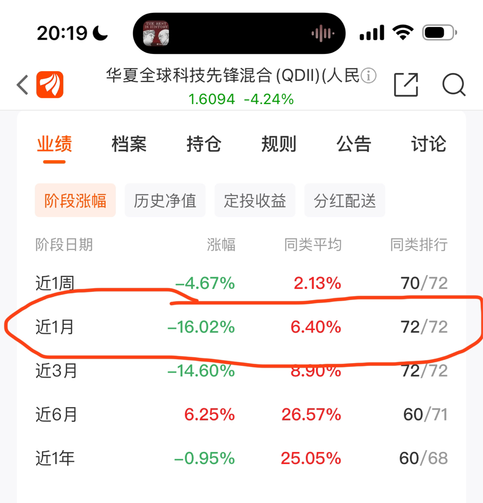 $华夏全球科技先锋混合(QDII)(人民(OTCFUND|005698)$ 给所有打算买入这个基金的提个醒,最近一个月收益在同类基金中排名倒数第一,有图为证