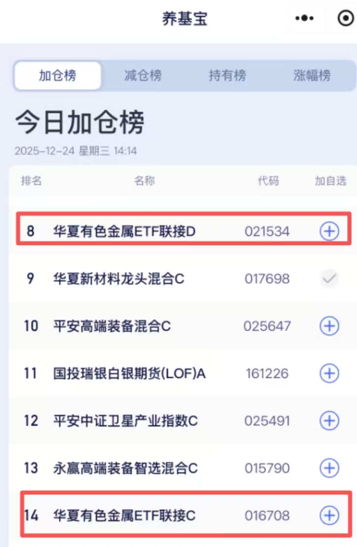 俩份额都上榜加仓榜什么概念,最近这里都连红三天了,今天继续上扬ing,近3个月24.40%,同类排名第26,而且各阶段收益都很优秀,今天估值还是红的,看来还会有4连涨,$华夏有色金属ETF联接C$值得点赞