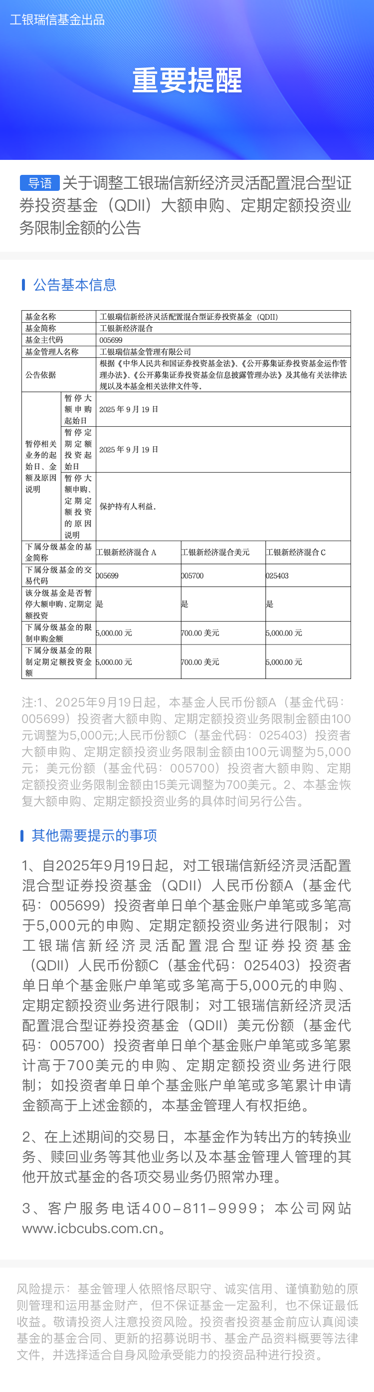 【重要提醒】关于调整工银新经济混合(QDII)大额申购、定投业务限制的公告