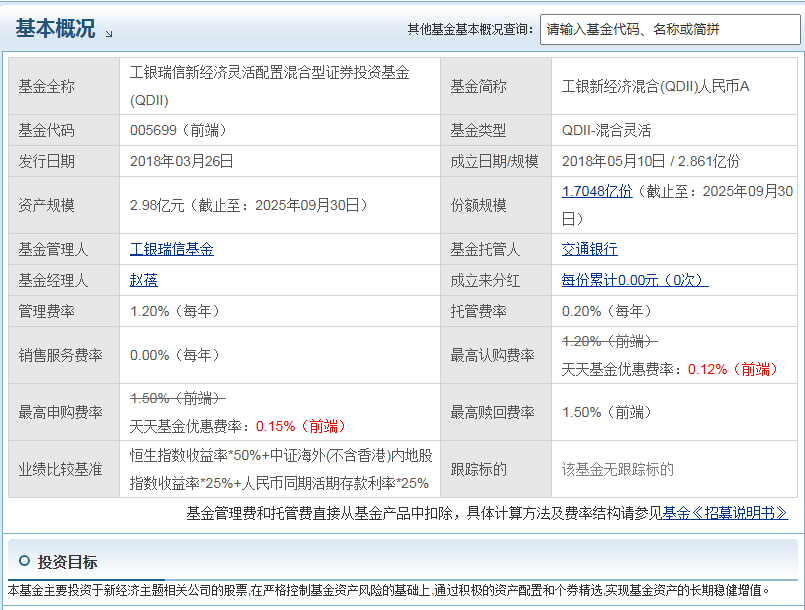 工银新经济混合(QDII)人民币A(005699)主要投资新经济主题相关公司的股票,新经济是未来发展的大趋势,涵盖科技创新、新兴消费、医疗健康等领域,这些领域成长空间大,能让投资者分享新经济发展带来的红利。如果你认可新经济领域的发展前景,追求长期稳健的投资回报,并且能够承受一定的风险,那么工银新经济混合(QDII)人民币A(005699)是可以考虑持有的基金产品。