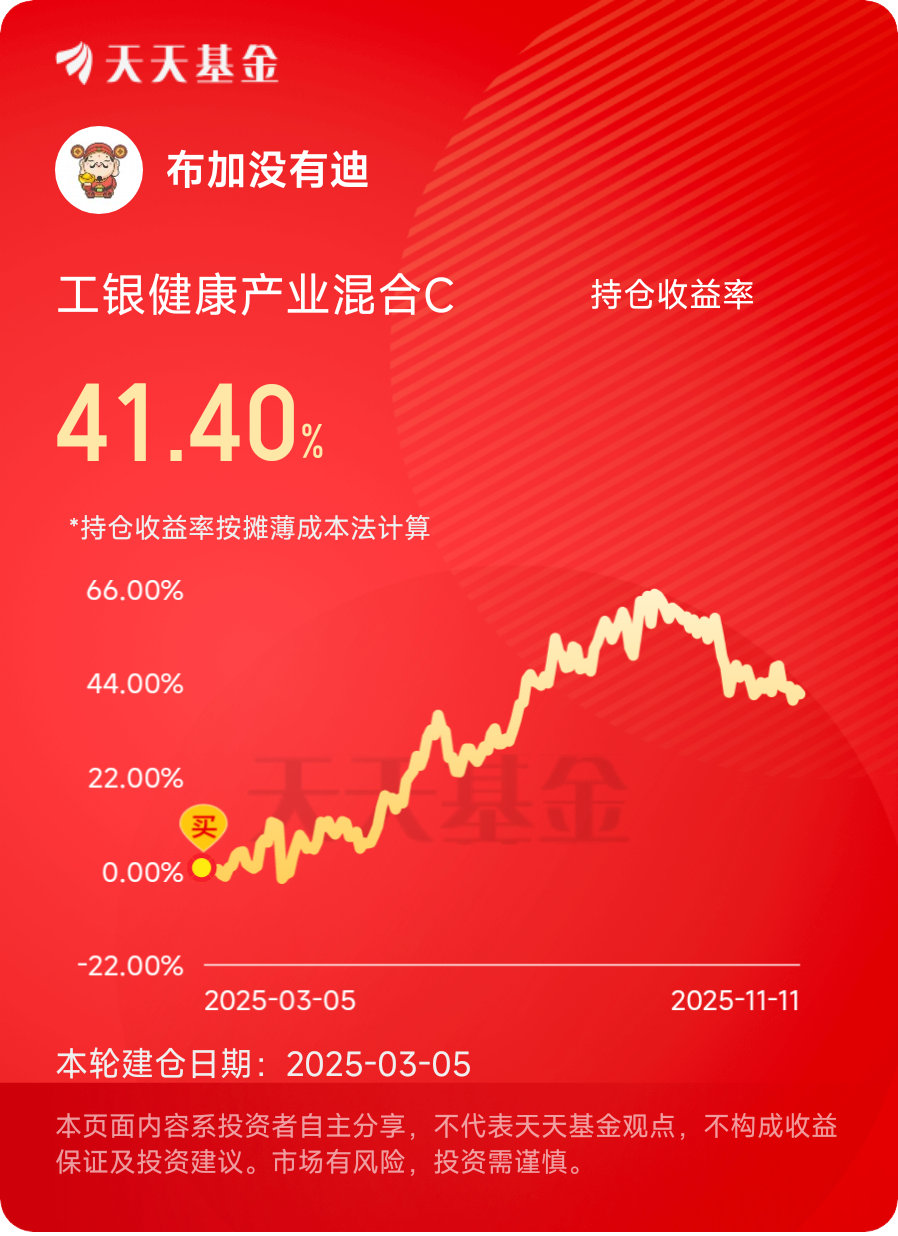 便捷的交易体验与透明的运作模式更让这款基金加分不少。作为C类份额基金,其销售服务费更低,且持有一定期限后免赎回费,极大降低了长期持有与分批加仓的成本,非常适合普通投资者进行长期布局。基金定期报告对持仓结构、投资策略的详细披露,让我能够清晰了解基金运作逻辑,便于根据市场变化调整投资节奏。从买入至今,无论是行情上涨时的收益兑现,还是市场调整时的从容应对,工银健康产业混合C都展现出专业的管理水平,让我真切感受到优质基金产品带来的省心与放心,也进一步坚定了我长期持有的决心。