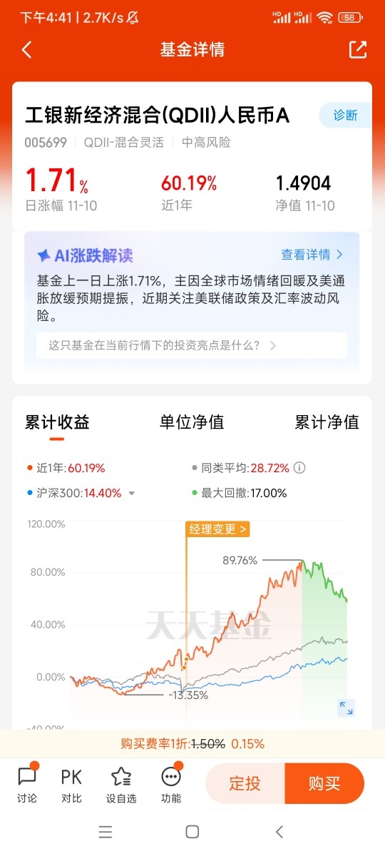 对于工银新经济混合(QDII)人民币A的投资前景,我抱有十足信心并做好了长期布局的准备。短期来看,四季度医保谈判落地、海外学术会议利好释放、产业链景气度持续上行,都将为基金净值增长提供强劲动力;长期来看,中国创新药研发实力持续提升、国际化进程加速,叠加全球对创新医疗需求的持续增长,港股创新药板块的长期成长空间广阔。这款基金通过聚焦全球优质创新药资产,既能够享受国内政策红利,又能把握海外市场增长机遇,这种“双重优势”使其在长期投资中具备更强的竞争力。