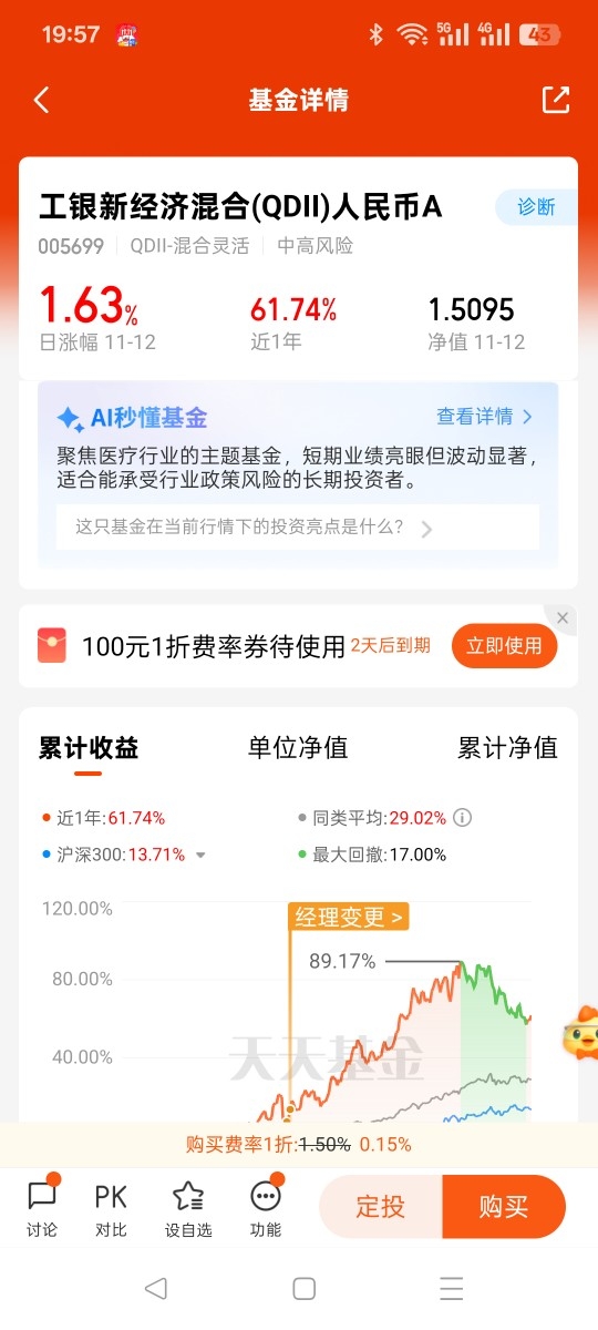 我暂未布局创新药,计划观望一段时间再借$工银新经济混合(QDII)人民币A$ 布局,毕竟我对工银瑞信的基金还是挺信任的。该基金前十大重仓全是创新药龙头,港股占比超 60%,今年回报率已超 70%,能精准捕捉板块红利。