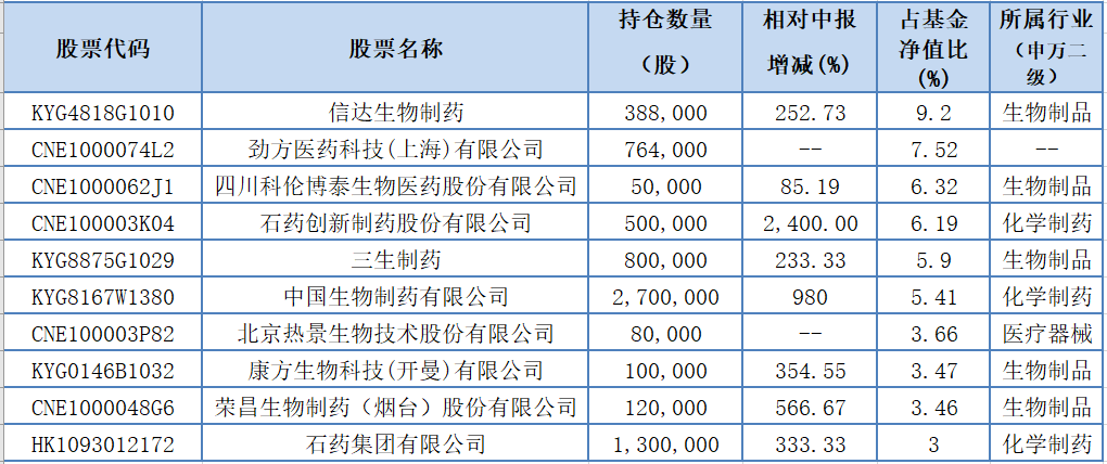 三季报披露的前十大重仓股,都是创新药企业。包括8只港股和2只A股。其中既有持仓较长时间的股票,也有首次进入三季度前十大重仓股的股票,部分股票或是因加仓与股价大幅上涨而进入前十大重仓股。