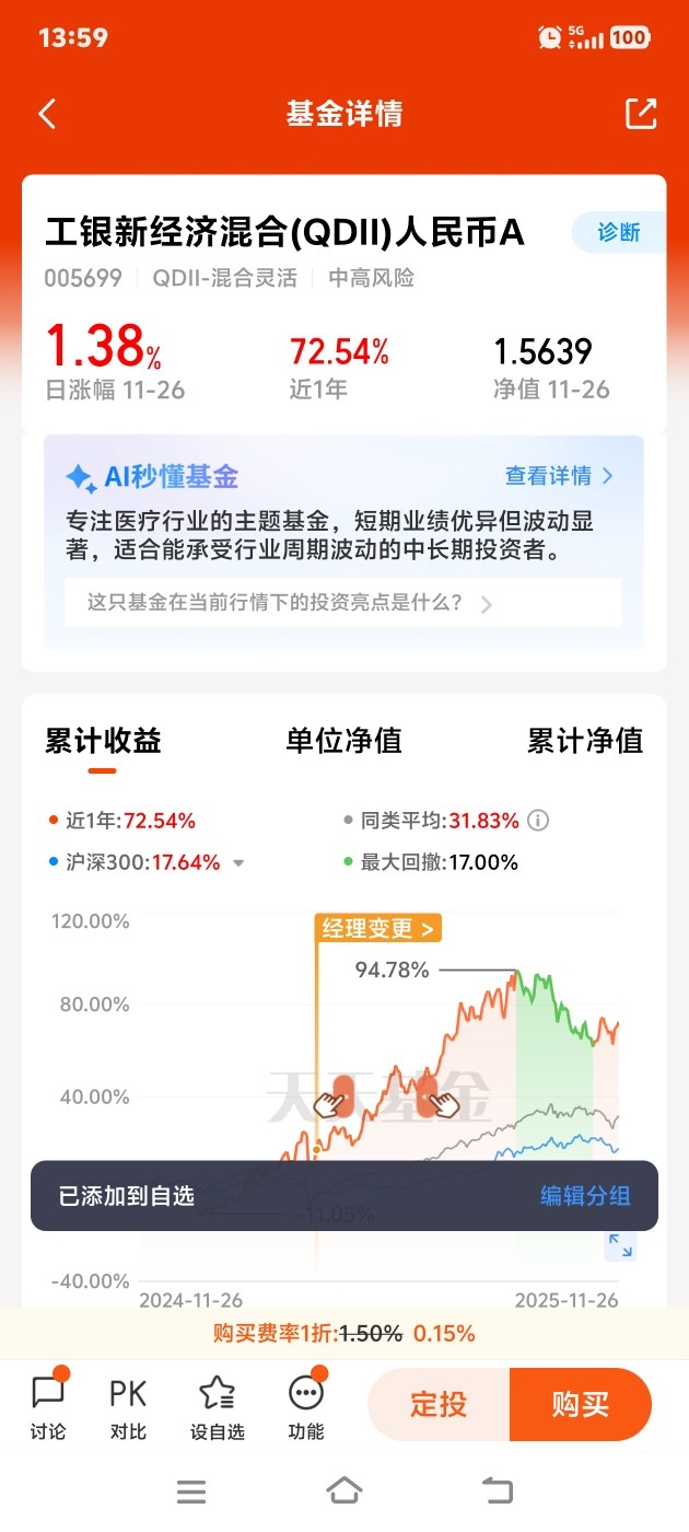 综上,$工银新经济混合(QDII)人民币A$ 基金凭借优秀的基金经理管理、高纯度的港股创新药持仓、与行业节奏高度契合的调仓策略,成为当前布局创新药赛道的优质载体。当前板块回调并未改变基本面向上的长期逻辑,反而带来了难得的低位配置窗口。对于认可创新药行业成长价值、能够承受短期波动的投资者而言,该基金有望充分享受后续板块估值修复与业绩增长的双重红利,值得重点关注。