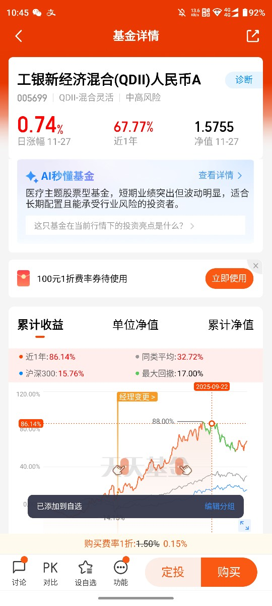 对于$工银新经济混合(QDII)人民币A$ 而言,其跨市场配置特性与创新药产业趋势高度契合。该基金前十大持仓中包含多家受益于商保目录政策的港股生物科技公司,这些企业凭借FIC/BIC药物(如CAR-T疗法)在本次医保谈判中获得差异化支付通道支持。基金近三月13.2%的涨幅(数据截至2025/11/23)部分反映了市场对创新药政策的乐观预期,但考虑到商保目录将于2026年1月正式实施,相关企业收入兑现存在6-12个月的滞后期,当前估值仍具吸引力。