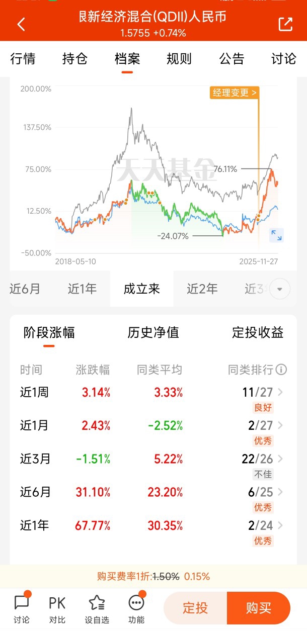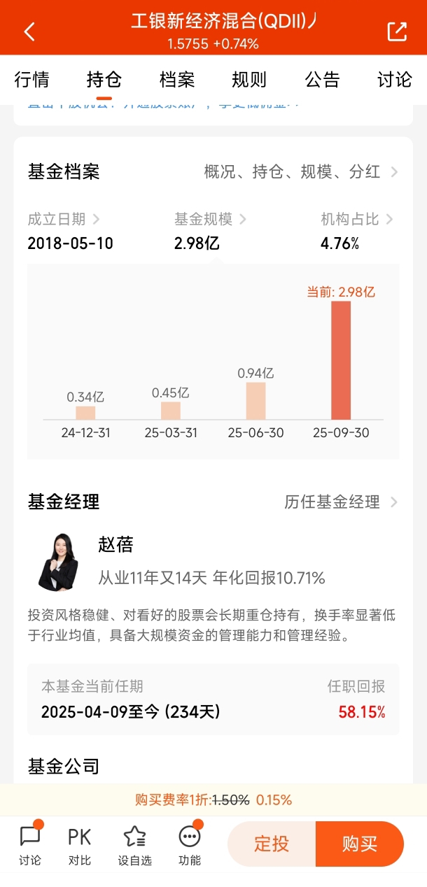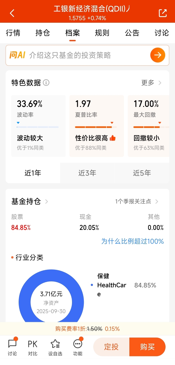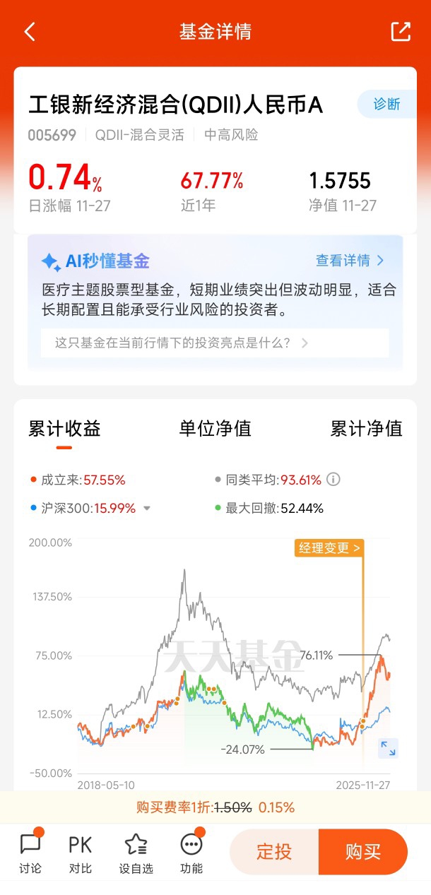 对于长期定投的投资者而言,费率结构和流动性至关重要。工银新经济混合A作为一只QDII基金,为投资者提供了配置海外创新药资产的便利工具。费率下调后(管理费1.20%,托管费0.20%),降低了投资者的长期持有成本。