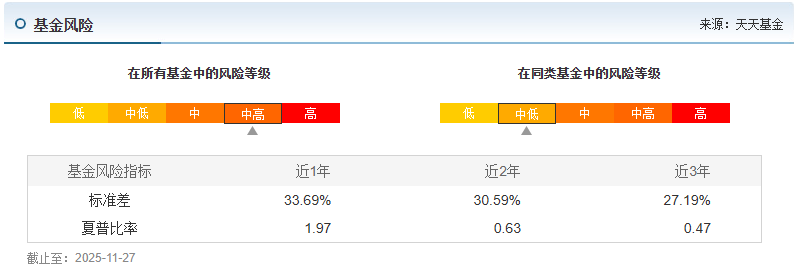从风险调整后收益看,基金的表现同样出色。根据最新数据,基金的近1年夏普比率为1.76-2.19,优于67%-96%的同类基金;最大回撤为14.21%-17%,优于67%的同类基金;年化波动率为33.7%-34.12%。这些指标表明,基金在承担相对较低风险的同时,获得了显著的超额收益。