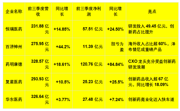 百济神州的扭亏为盈最具标志性意义。公司第三季度实现营收100.77亿元,同比增长41.1%;净利润6.89亿元,同比扭亏为盈。其中,仅核心产品泽布替尼就实现了单季度10.4亿美元的销售额,充分证明了中国创新药的国际竞争力。