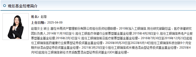 赵蓓的投资经历堪称辉煌。自2014年11月18日起,她担任工银瑞信医疗保健行业股票型基金经理,截至2025年三季度末,该基金任职回报率高达219.20%。她还管理着工银前沿医疗股票、工银养老产业股票等多只医药主题基金,在管基金资产规模达到232.35亿元。赵蓓的投资风格强调"产业趋势投资",注重基本面研究与长期价值,采用高集中度、低换手率的"狙击手"模式,秉持"深度研究、长期持有"理念。