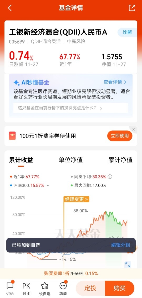 $工银新经济混合(QDII)人民币A$ 跨市场进行全球化布局,同时配置A股+H股+美股创新药龙头,捕捉全球机会,新经济主题与创新药高度契合,很好的捕捉到全球创新药发展机遇,今年前九个月曾拿下超106%的收益表现,投资回报明显,目前创新药从高点回撤幅度较大,叠加政策、产业进展与市场需求,有望带来创新药新一轮发展行情,四季度的创新药也许在12月份会有强续进攻机会,可以尝试低吸~