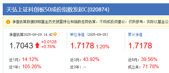 $天弘上证科创板50成份指数发起C$ 今天继续涨,近一年已经涨了一倍了!不愧是是从科创板中精选出的50只龙头,科创50指数前十大成份股集中在科创产业细分赛道龙头公司,合计权重达60%,集中度较高。成份股紧贴“硬科技”发展方向,不仅包含寒武纪、中芯国际等半导体产业龙头,也包含其他细分产业龙头公司,指数费用也便宜,我今天吃一波肉,然后回调还会继续跟上这个。