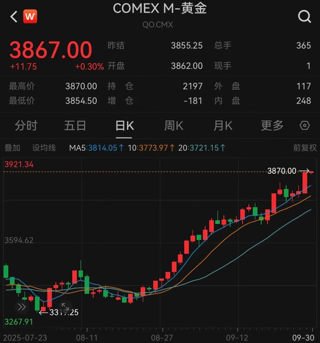 金价继续涨,COMEX金价一度达到3870美元/盎司。金价真的超过上证指数了,而且长期黄金更容易走出慢牛。这轮美联储开启降息,进一步为全球股市提供了更多流动性,很多资金纷纷涌入股市、大宗商品等。我目前持有100多万的纳指和20多万的黄金,这部分仓位不算多,长期也会继续增持。