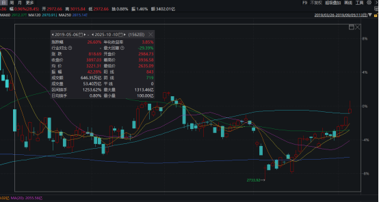 2019年5月6日,特朗普首次对中国挥舞关税大棒,上证指数单日暴跌5.58%,收于2906点,至今上涨了26.6%。