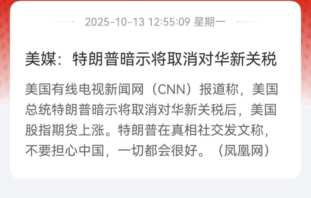 上周五晚上11点,全球股市突然大跳水,股市纷纷大跌,稀土政策有变化直接把特朗普搞破防了。特朗普称要从11月1日起加100%的关税。但市场很明白特朗普的套路(TACO交易),每次都是话说的特别狠,但总是到边上认怂。4月份的时候,特朗普也是过了一周就认怂了。目前市场预计11月1日加关税的概率只有14%。