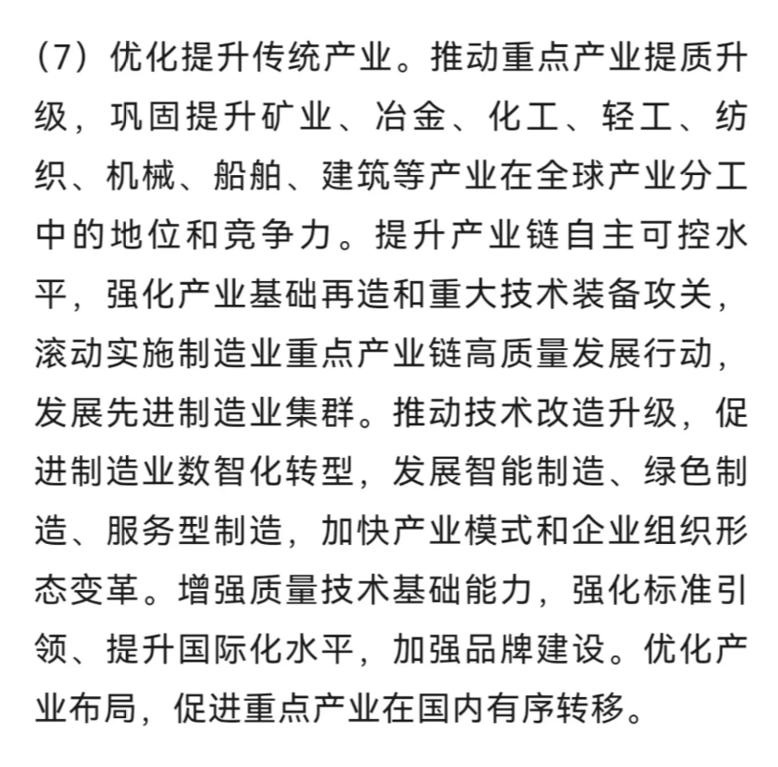 1、传统行业。第7条提到矿业、冶金、化工等8个行业。这些都是我国具备全球竞争力的优势行业。有相当一部分是周期性行业,与当前的“反内卷”相吻合。需要注意,里面没提房地产。