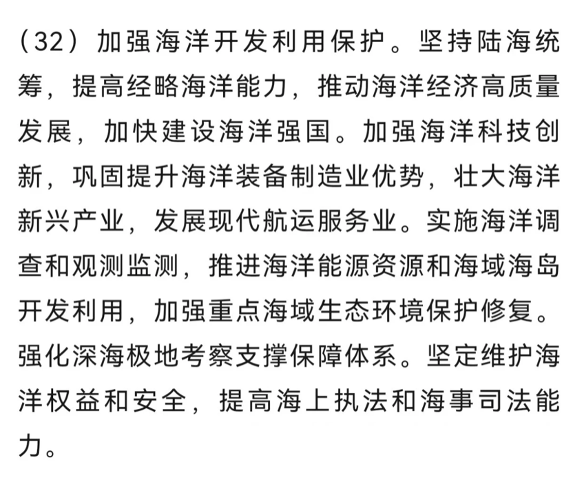 6、建设海洋强国。第32条专门列了一段。巩固提升海洋装备制造业,壮大海洋新兴产业,发展现代行业服务业。深海科技后市值得关注。