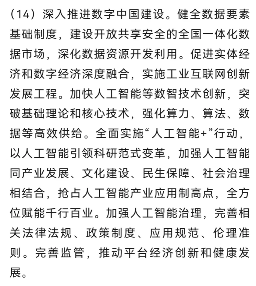 4、数字中国。第14条专门阐述了人工智能+。这个产业链很长,上游芯片被卡脖子,重点是中游(算法、算力、数据高效供给)。特别是下游,要抢占人工智能运用的制高点,全方位赋能千行万业。