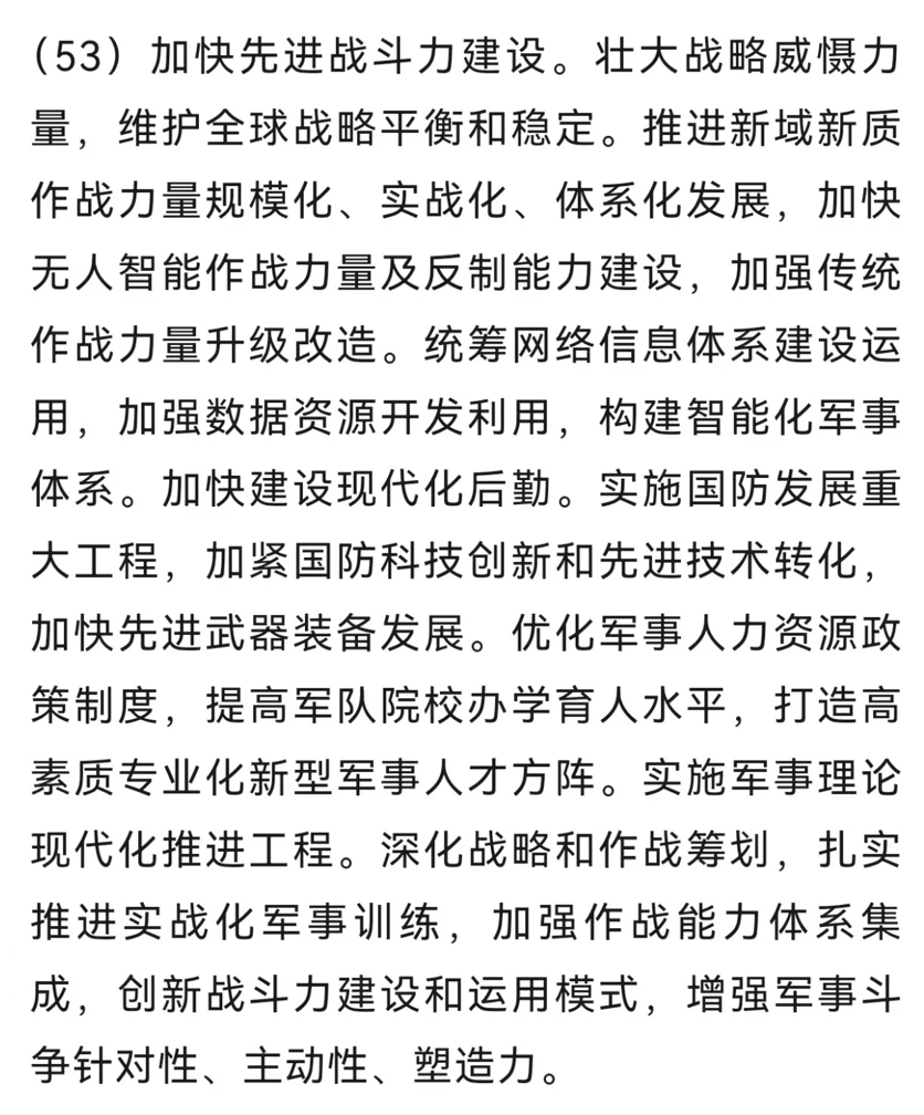 8、先进战斗力。第53条信息量很大。罕见的提出“壮大战略威慑力量”。新质作战体系覆盖面很广,军工整个大方向值得重点关注。同时这些技术与民用产业相通,存在军民融合,航空航天、人形机器人、低空经济、卫星互联网、商业航天等都受益。