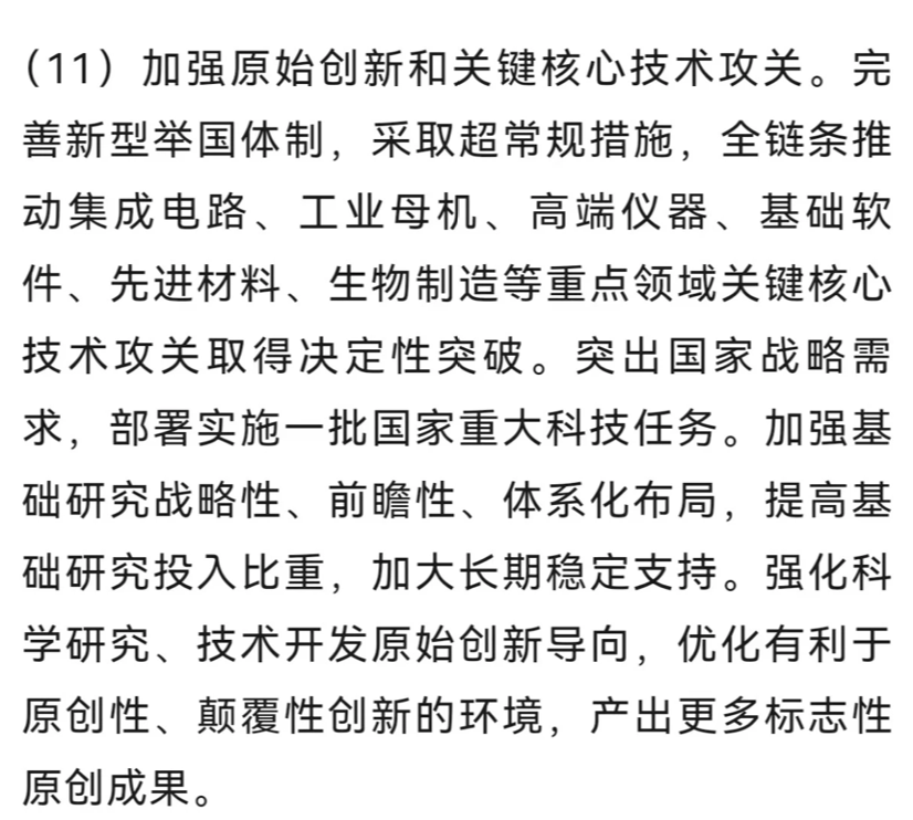 3、自主可控。第11条明确提出集成电路、工业母机、高端仪器、基础软件、先进材料、生物制造6个方向。这些都是要动用举国机制,解决卡脖子问题的行业。先进材料与新兴产业的“新材料”有一定重合,生物制造同时也是未来产业。