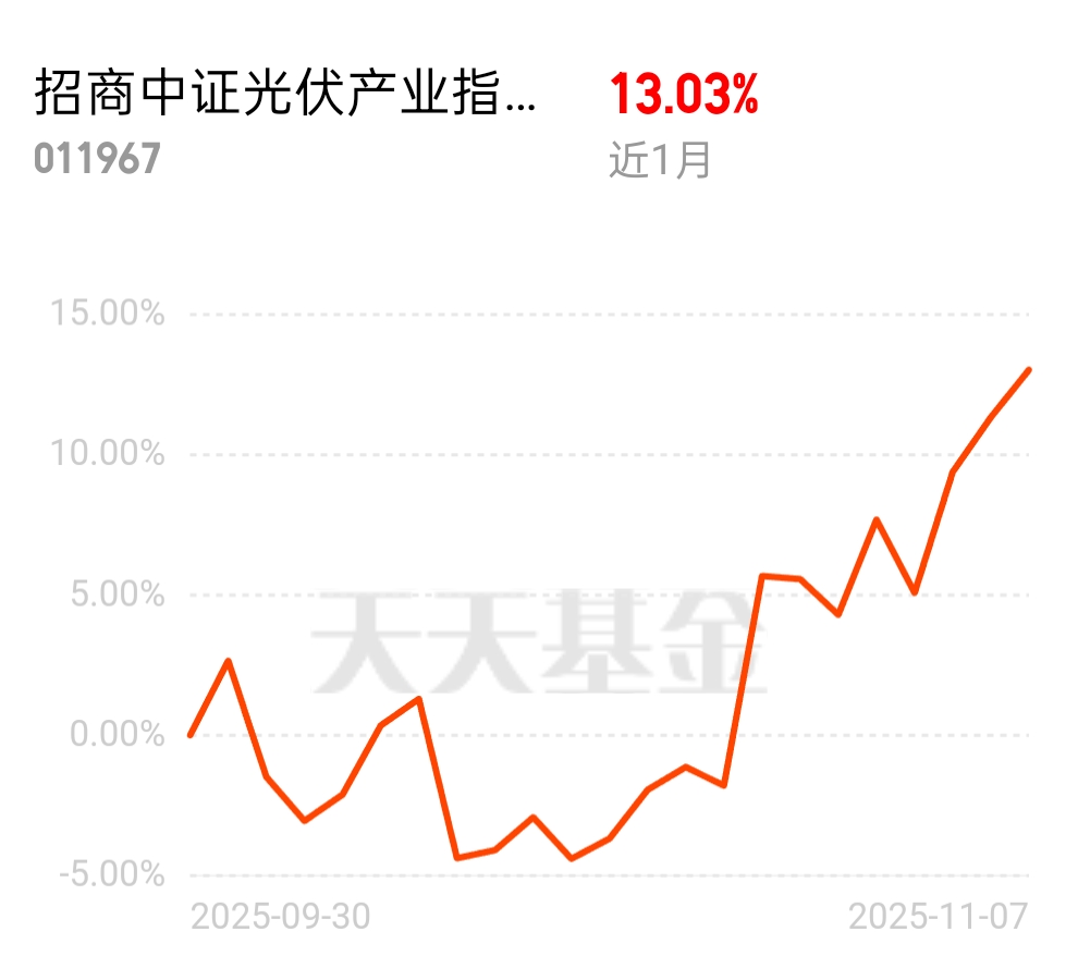 整县推进光伏的政策越来越多,农村安装光伏还有贷款支持,普及速度越来越快。招商中证光伏产业指数C近1个月涨了13.03%,紧跟国内光伏普及的热潮,普通人也能分杯羹。
