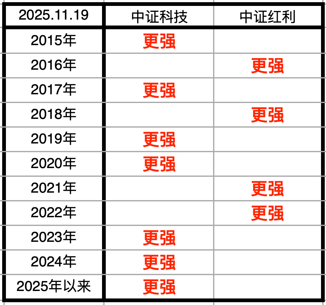 历史上也有多次科技和红利风格轮动,我梳理了2015年至今科技和红利的对比:近11年的时间里,7年科技更强,4年红利更强。但科技的波动更大,从持有体验来说红利会更好些。