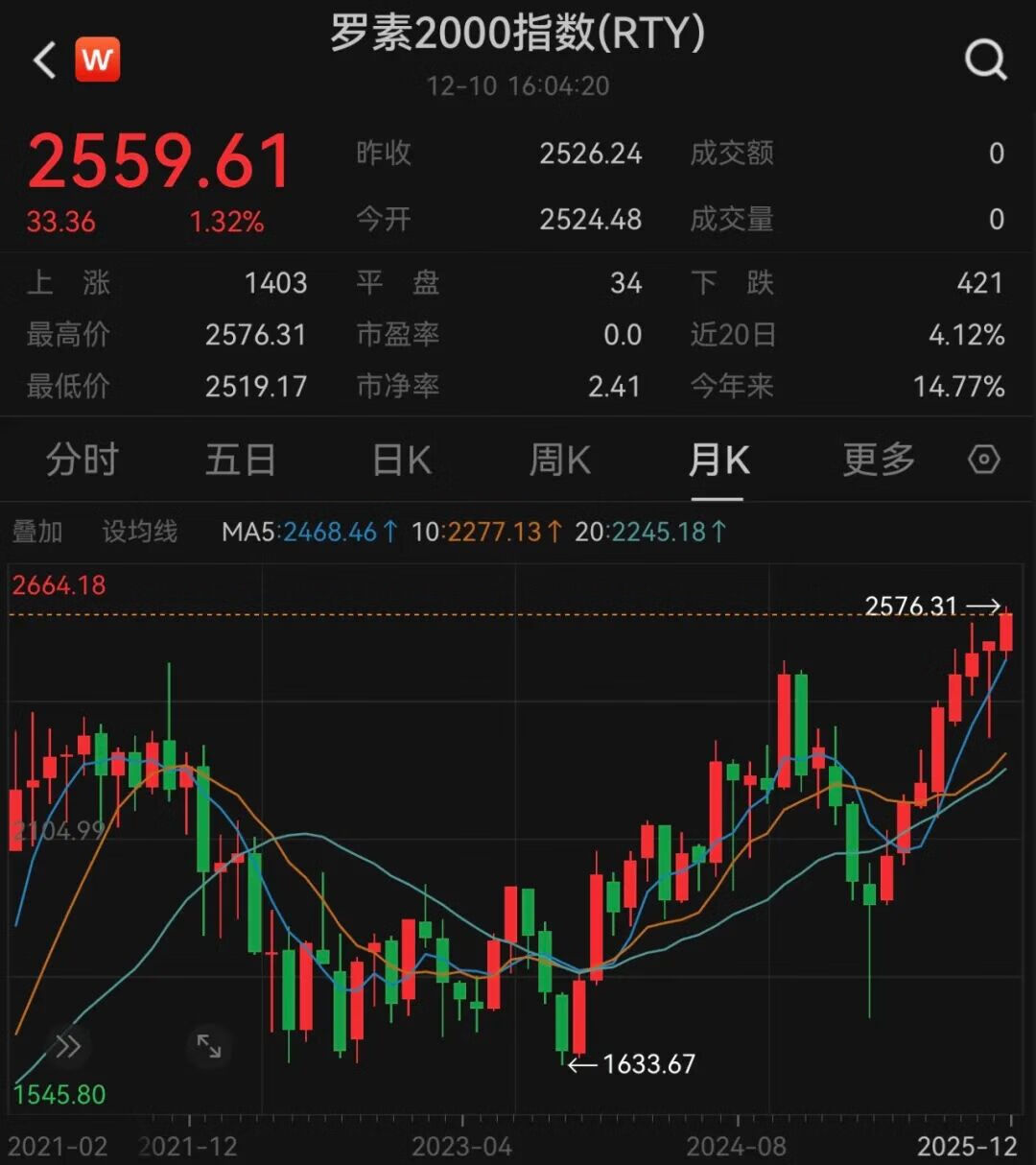 昨晚纳斯达克100涨了0.42%,代表美股中小型公司的的罗素2000涨了1.32%,反而是小盘涨的多。标普500和罗素2000(有点类似于咱们的A500和中证2000),前者代表500家大型龙头公司,市值中位数是数千亿美元;后者代表美国的中小型公司,市值中位数是20-30亿美元。