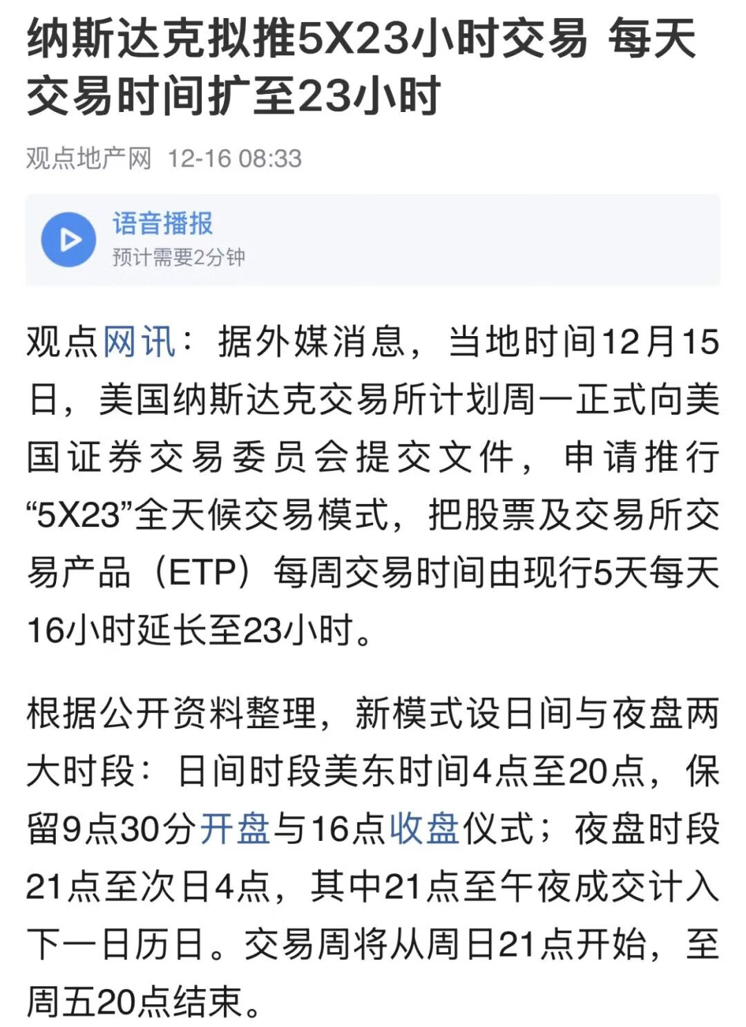 昨晚纳斯达克100涨了0.26%。以后纳指每天的开盘时间,从现行的每天16个小时延长到23个小时。之前因为时差的原因,美股那边半夜开盘,咱们这边都要睡觉了,以后美股几乎全天开盘了,到时候全球的投资者都可以在白天玩美股了,这也会进一步吸走全球股市的流动性。交易所也玩内卷,开始拼开盘时间了,相对来说大A最只开盘4个小时,确实也有点短了。今天我继续补点。