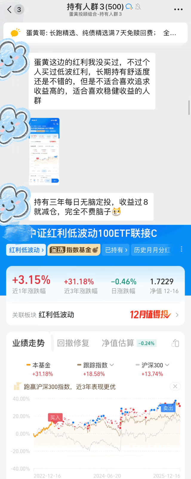 红利低波、纳指、固收,这三个我觉得比较适合散户长期持有,甚至可以长期躺平。比如今天有群友在群里分享他买了红利低波的体验,他觉得长期持有红利低波体验还是不错的,适合追求稳健收益的人。从业绩走势来看,红利向上的趋势也没有变。