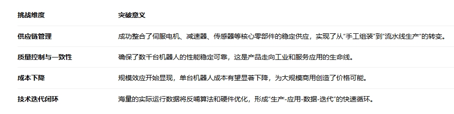 在机器人领域,从1到100台是“工程样机”,从100到1000台是“小批量试产”,而从1000到5000台则意味着真正的工业化量产能力。这背后是一系列巨大的挑战和突破: