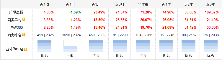 数据显示,该基金近1周收益率达到4.83%,近3月收益率达到23.49%,近6月收益率达到74.57%,近1年收益率达到74.9%,近2年收益率达到88.66%,近3年收益率达到109.67%,近5年收益率达到130.36%,今年来收益率达到71.28%。从2018年6月25日成立以来,收益率达到了250.49%,这样的历史收益表现说明这只基金在过去的投资中取得了不错的成绩,一定程度上反映了它的投资能力。