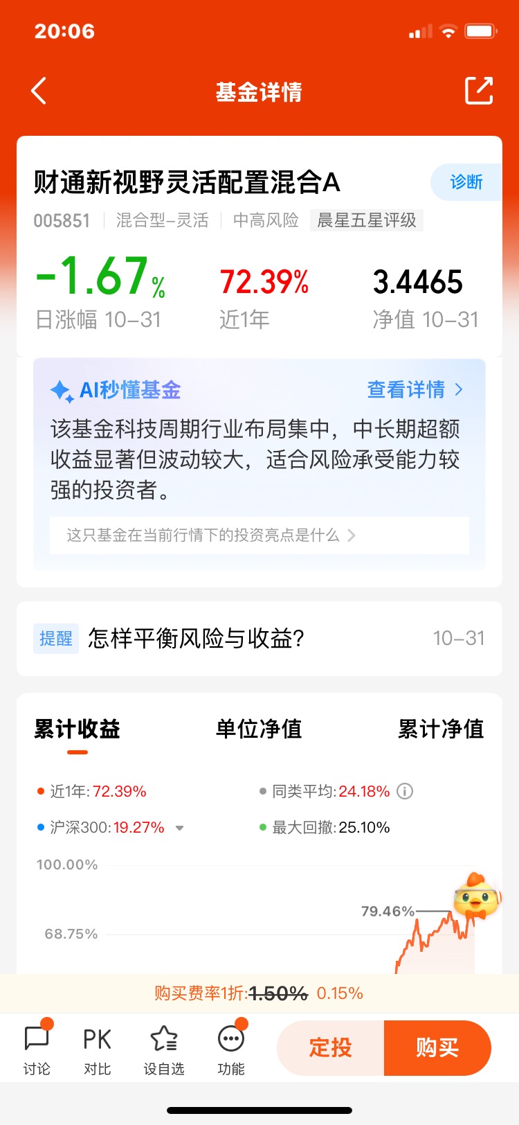 #如何在市场中寻找风险与收益的平衡点# $财通新视野混合A$&$财通新视野混合C$ 在投资的世界里,我们常常陷入一种两难:看到别人通过基金赚得不少,于是跟风入场,结果往往遇到市场回调;如果求稳把钱全放定期,又眼睁睁看着通货膨胀慢慢吃掉我们的收益。市场从来没有什么“稳赚不赔”的神话,也没有“绝对安全”的选择。我们要找的,不是固定的标准答案,而是一个适合自己情况的动态平衡点。这个平衡点藏在每个人的投资目标里——比如,你是为了三年后买房,还是为了二十年后养老?它也藏在我们的风险承受力中。今天,我想和大家聊聊,如何在风险和收益之间找到那个“不慌不忙”的支点,并结合我个人的投资思考,探讨一下科技板块的潜力。